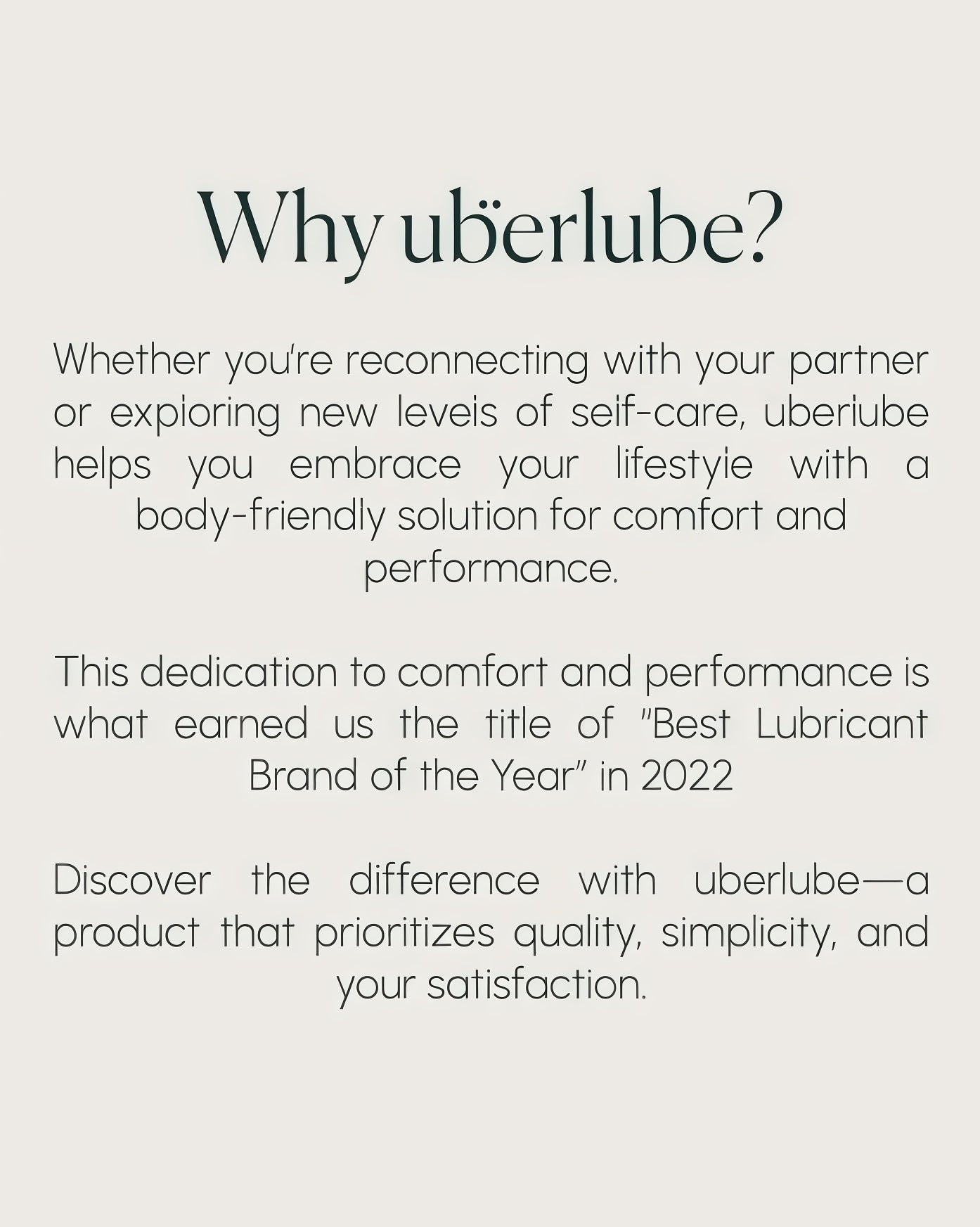 Uberlube is hands-down the best lube I’ve ever used! It’s silky smooth, long-lasting, and doesn’t dry out or get sticky. I love that it’s unscented, flavorless, and safe with latex, making it perfect for any situation. A little goes a long way, and it feels luxurious every time. Truly a game-changer for my bed room activity, my new go-to for couples, solo use, and everything in between'